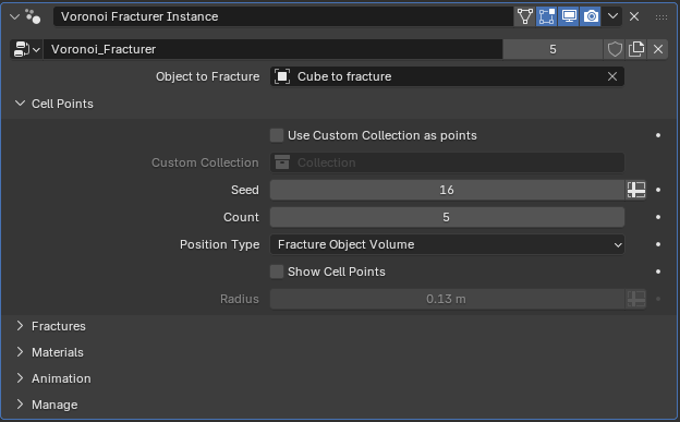 Select the object you want to fracture in the geometry nodes modifier properties tab. Choose a custom collection as cell points, of just use the predefined points, change the seed, count and position type option( cube, sphere, object surface, object volume).